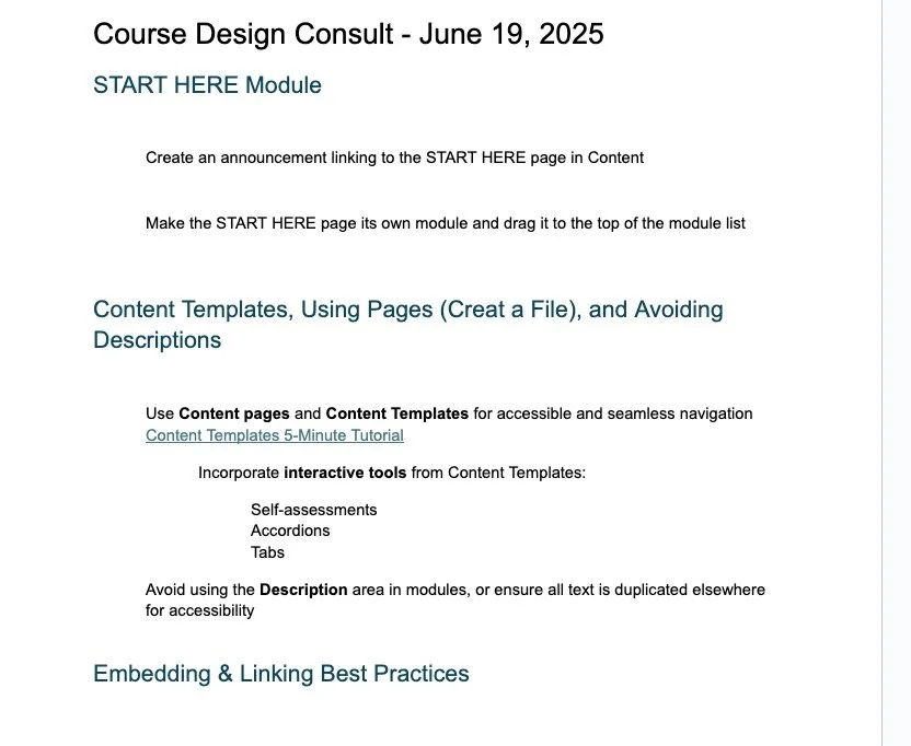This is an example of a follow-up document that I shared with an instructor after a course design consultation. It reinforces and expands on topics discussed during the meeting, offering targeted, accessible how-to resources for implementing D2L features, media tools, and content templates to support inclusive and engaging online learning.