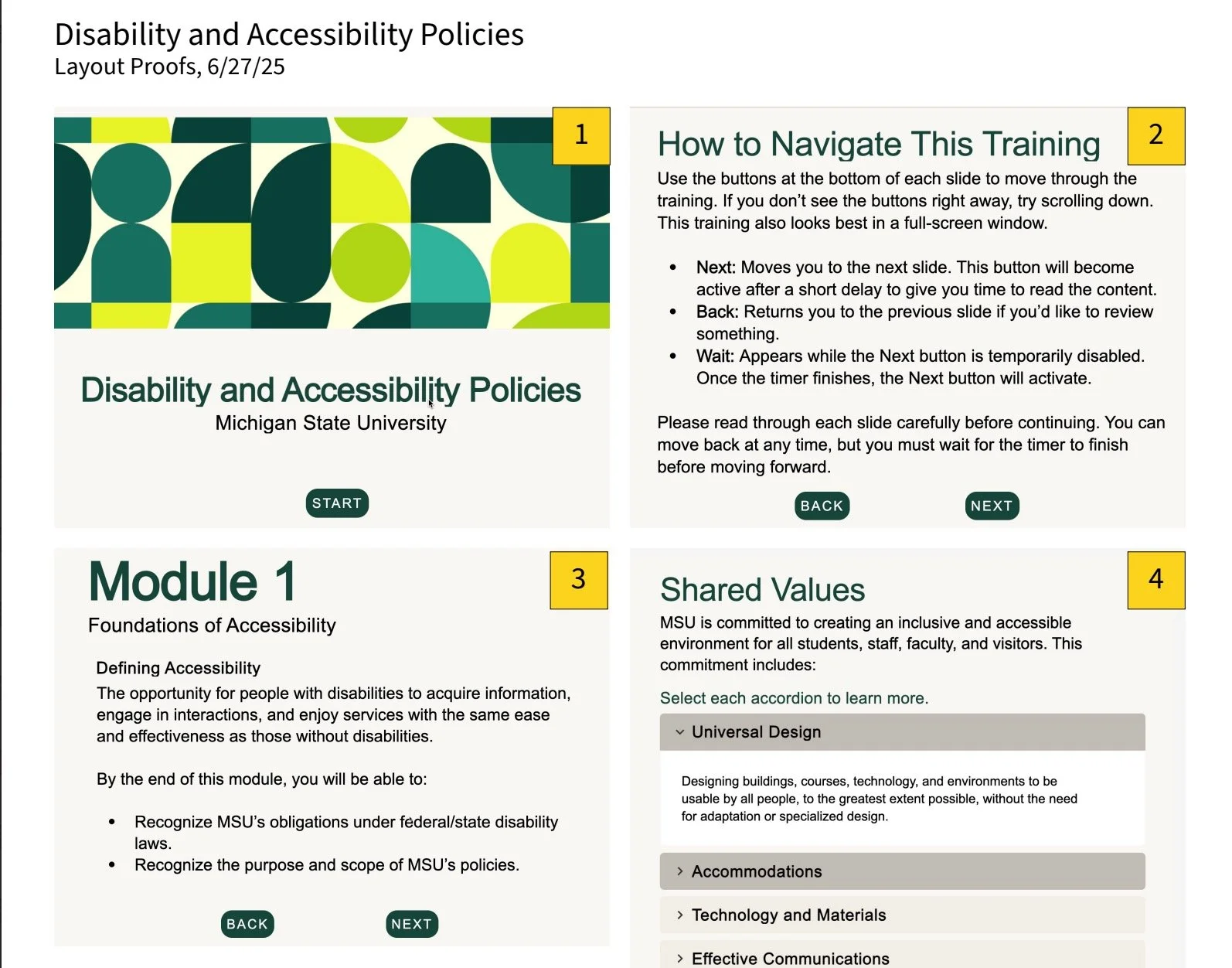 This asynchronous training was developed with other instructional designers and several Subject Matter Experts (SMEs) to introduce all MSU faculty and staff to foundational accessibility concepts, supporting the university’s commitment to meeting WCAG standards and broader federal accessibility requirements. The module covers both digital accessibility and the accommodations process, offering an overview of relevant laws such as the ADA and Section 504, along with guidance for employees and supervisors. Designed to promote inclusive practices across campus, the training includes interactive elements and assessment questions to reinforce understanding. I contributed to the development of instructional content, collaborated with SMEs, collaborated on Captivate development, and oversaw the review process and user testing in the Ability LMS.