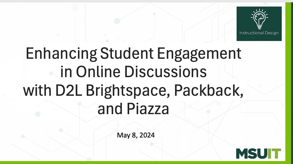 This workshop segment introduces instructors to student engagement strategies using D2L Discussions and Packback, demonstrating how to configure, use, and evaluate each tool effectively within the MSU learning environment.
